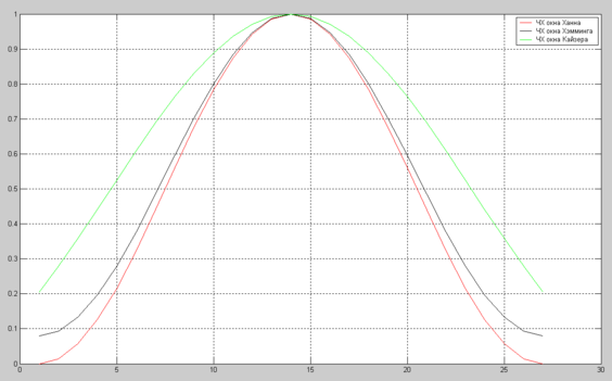 Рис. 12 Вид частотных окон Ханна, Хэмминга и Кайзера