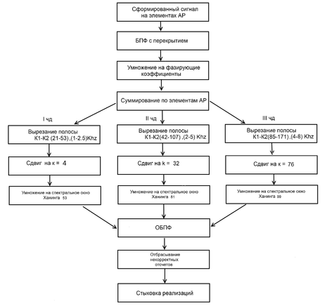 На следующем этапе происходит формирование канала наблюдения в частотной области путем сложения спектров реализаций с приемных элементов АР, умноженных на заранее рассчитанные фазирующие коэффициенты на это направление.