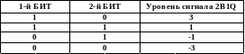 Модуляция САР сочетает в себе последние достижения модуляционной технологии и микроэлектроники. Несущая частота модулируется по амплитуде и фазе, создавая кодовое пространство с 64 или 128 состояниями, при этом перед передачей в линию сама несущая, не передающая информацию, но содержащая наибольшую энергию, "вырезается" из сигнала, а затем восстанавливается микропроцессором приемника. Модуляция CAP-128, применяемая в системах SDSL (2 Мбит/с по одной паре), имеет 128-позиционную модуляционную диаграмму и, соответственно, передает 7 бит за один такт. Итогом повышения информативности линейного сигнала является существенное снижение частоты сигнала и ширины спектра, что, в свою очередь, позволило избежать диапазонов спектра, наиболее подверженных различного рода помехам и искажениям. Код 2B1Q представляет собой четырехуровневый амплитудно-модулированный сигнал, в котором два двоичных разряда преобразуются в один кватернарный символ. Это достигается путем группировки двух следующих друг за другом бит в битовое поле, в котором первый бит представляет знаковый бит, а второй бит представляет амплитуду. Это дает четыре возможных выходных символов, как это показано в таблице 2.1. То есть в каждый момент времени передается 2 бита информации (4-ре кодовых состояния).