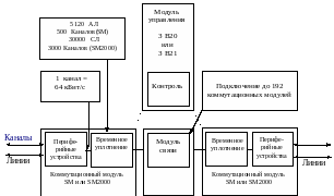 Коммутационный модуль обеспечивает функционирование линейных блоков обслуживания (2048), при общем количестве линий в модуле 5120. Количество линейных блоков интегрированного обслуживания ограничено 4 или меньше, так как ограничено количество портов интерфейса передачи данных, подходящих для вышеупомянутых блоков, а также для блоков коммутации пакетов.
