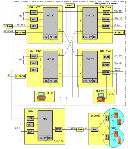 Коммутационный модуль КМ состоит из универсальной коммутационной системы (УКС) и устройства управления (УУ). В состав УКС входят: блок пространственно-временной коммутации емкостью 32 или, в будущем, 128 32-канальных линий ИКМ (УКС-32 или УКС-128) и соответствующее сигнальное, генераторное и управляющее оборудование.