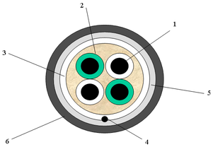 Рисунок 3.2 - Конструкция кабеля типа КСПП: 1 - токопроводящая жила; 2 - изоляция жилы; 3 - поясная изоляция; 4 - экранная медная проводка; 5 - алюминиевый экран; 6 - полиэтиленовая оболочка