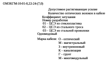 Учитывая трассовые и грунтовые условия местности, на проектируемом участке, используем оптический кабель производимый ЗАО «Москабель-Фуджикура» ОМЗКГМ-10-01-0,22-24(7,0).