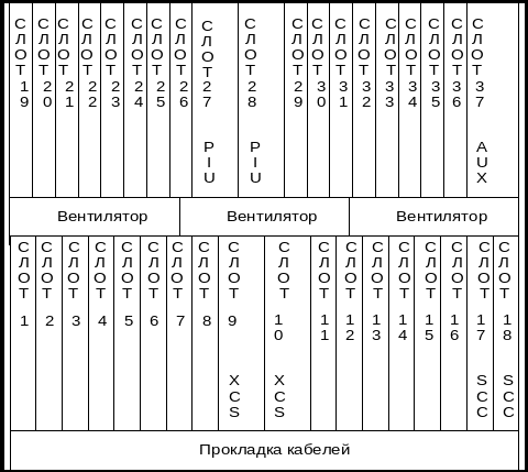 Мультиплексор OptiX OSN 3500 с двухрядным расположением модулей устанавливается в статив стандартизированный ETSI (2200мм х 600мм х 300мм), причем в одном стативе может быть размещено два мультиплексора OptiX OSN 3500 (730мм х 496мм х 295мм). Непосредственно на мультиплексоре все оптические выводы находятся на лицевой стороне оптических интерфейсных модулей. Подключение электрических интерфейсов, осуществляется в верхней части мультиплексора. На рисунке 6.2 показано распределение слотов оборудования OptiX OSN 3500. Платы обработки и платы интерфейсов располагаются в слотах как показано на рисунке 6.2 и в таблице 6.1.