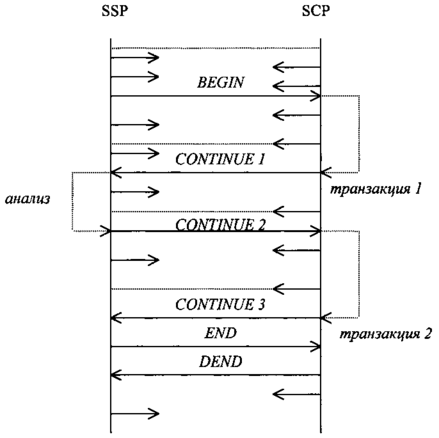 Сообщение, полученное SCP, анализируется, обрабатывается компьютерами, в результате чего SSP получает ответ из SCP, в котором содержится информация о том, как произвести услугу. В общем случае, подобный диалог может состоять из нескольких транзакций, т.е. из нескольких циклов запрос-ответ, обеспечивающих выполнение требуемой услуги. На рисунке 6.3 представлен диалог, содержащий две транзакции. Короткими стрелками показаны другие сообщения, циркулирующие в дуплексном канале ОКС №7 и не относящиеся к данной транзакции. Это могут быть либо сообщения других транзакций, либо служебные сигнальные единицы (СЕ), либо «пустые» СЕ, обеспечивающие синхронизацию работы канала ОКС №7 [7].