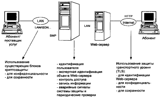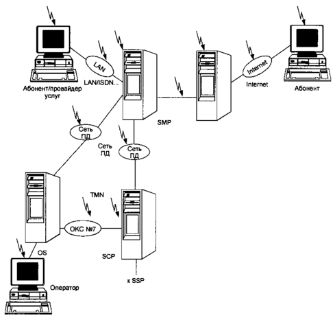 На рисунке 8.2 SMP (узел администрирования услуг), например, может быть напрямую связан через LAN или ISDN с подписчиками, провайдерами услуг или Web-сервером. В связи с этим, возникает угроза нелегального проникновения подписчика, провайдера услуг или Web-сервера, которые могут