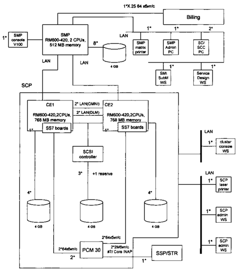 SMP связан с SCP при помощи внутрисистемного интерфейса посредством локальной сети LAN с использованием протокола Ethernet (рисунок 3.1). Интерфейсы с внешним окружением (оператор сети, поставщики и абоненты услуг) базируются на протоколах Х.25, TCP/IP, RS232 - V.24. В проекте реализована конфигурация «ведущий-ведомый» из двух серверов типа RM600-420 семейства RM, производства фирмы Siemens Nixdorf (SNI).