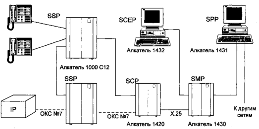 Широко применяются в странах СНГ продукт для интеллектуального решения фирмы Alcatel. Консорциум Alcatel представляет комплексное решение ИС, основанное на полном и совместимом ряде изделий, которое позволяет оператору построить мощную ИС даже в окружении сети с оборудованием разных поставщиков. Поставщик услуг может воплотить новые услуги быстро во всех типах сетей, включая ТфОП (PSTN), цифровую сеть с интеграцией служб (ISDN), подвижной сети связи (GSM) и ведомственные сети. На рисунке 3.2 изображена архитектура интеллектуальной сети Alcatel [6].