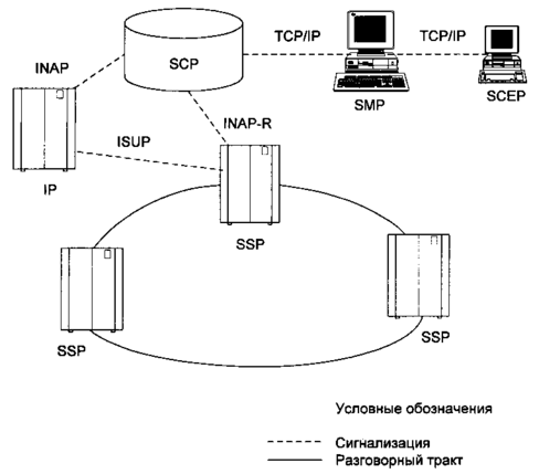 Интерфейс между SCP и SSP/IP поддерживает процедуру распределенной обработки вызова услуги ИС в структурах: клиент (SSP) - сервер (SCP) и клиент (SCP) - промежуточный объект (SSP) - сервер (IP) в соответствии с процедурой смены состояний динамической системы обработки вызова услуги ИС (Q. 1214) и прикладным протоколом INAP-R, использующим стек протоколов ОКС №7 TCAP/SCCP/MTP [18].