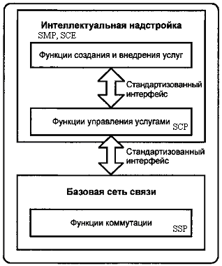 Согласно рекомендации ITU-T Q.I201 основополагающим требованием к архитектуре ИС является отделение функций предоставления услуг от функций коммутации и распределение их по различным функциональным подсистемам. Функции коммутации, как и для традиционных сетей, остаются в базовой сети связи, а функции управления, создания и внедрения услуг выносятся в создаваемую отдельно от базовой сети «интеллектуальную» надстройку, взаимодействующую с базовой сетью посредством стандартизованных интерфейсов [13].