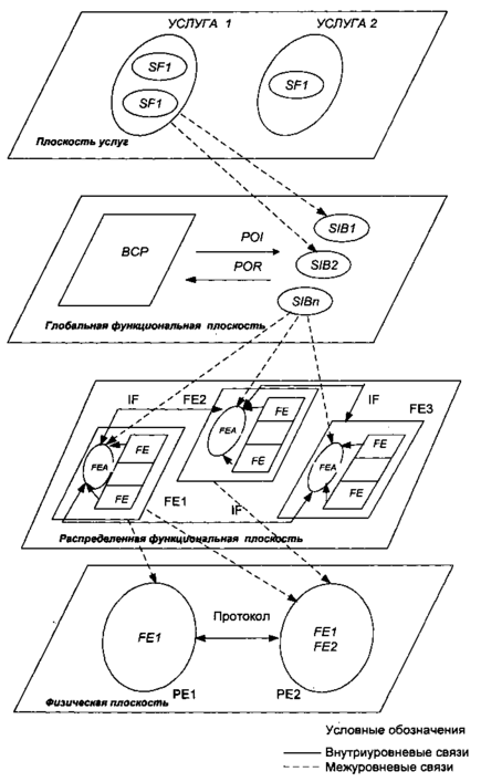 На рисунке 4.4 используются следующие обозначения: SF (Service Feature) - характеристика услуги; ВСР (Basic Call Process) - базовый процесс вызова; FE (Functional Entity) - функциональная единица; FEA (FE Action) - действие FE; PE (Physical Entity) - физическая единица; SIB (Service Independent Block) - независимый от услуг конструктивный блок; IF (Information Flow) - информационный поток; POI (Point of Initiation) - точка инициации; FOR (Point of Return) - точка возврата.