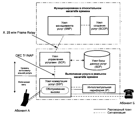 - SSP (Service Switching Point) - узел коммутации услуг, представляющий собой АТС с соответствующей версией программного обеспечения и выполняющий функцию управления вызовом и функцию коммутации услуги;