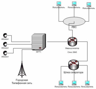 Маршрутизатор Cisco 3845 подключается к локальной сети интерфейсами Fast Ethernet и к телефонной сети интерфейсами Е1 через цифровую АТС АГУ. Настраивается связь между маршрутизатором Cisco 3845 и шлюзом оператора связи (рис. 3.1.).