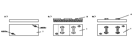 Рис. 9.2.1 Схема получения печатных проводников электрохимическим методом (а—заготовка платы с технологическими отверстиями, б—негативный рисунок схемы проводников, в—плата с печатными проводниками): 1 — основание платы, 2 — печатные проводники, 3 — кислотостойкая защитная краска