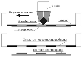 При проведении скребком по поверхности трафарета припойная паста продавливается сквозь отверстия в трафарете на контактные площадки. Наиболее важной фазой этого процесса является продвижение пасты вдоль поверхности трафарета, она должна продвигаться с правильной силой, углом и скоростью. Больше половины ошибок всего процесса сборки печатных плат приходятся именно на процесс нанесения припойной пасты. Преимуществом метода трафаретного нанесения припойной пасты является то, что паста может быть нанесена слоем до 300 мкм с очень высокой точностью.