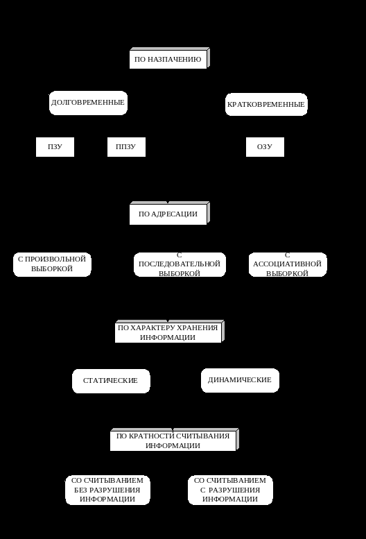 Накопитель предназначен для долговременного неразрушаемого хранения информации. Накопитель представляет собой совокупность двух блоков. Каждый их этих блоков делится на 4 и т.д. Такое деление обусловлено тем, что происходит уменьшение времени обращения к ячейке памяти, что в результате приводит к увеличению быстродействия.