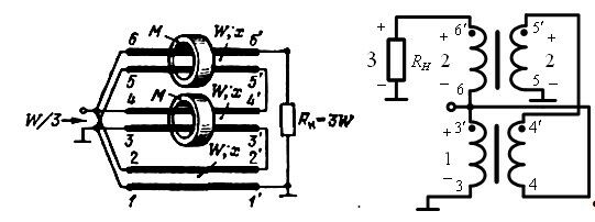 При этом шунтирующая индуктивность намагничивания, отнесенная к входу трансформатора (L1),будет определяться индуктивностью обмотки, образованной проводником 3-3', т.е. обмотки, напряжение на которой равно входному. Разное число витков для второй и третьей линий, размещаемых на общем магнитопроводе (при соблюдении требований равной их длины для выполнения согласования волнового процесса), приводит к необходимости включения (рис.1.1.2,б) еще одной ФЛ (по сравнению с ШТЛ 1:2). При размещении линий на разных магнитопроводах L1 определяется параллельным соединением индуктивности обмотки, образованной проводником 3-3', и одной четвертой части индуктивности обмотки, образованной проводником 6-6'. Если эти индуктивности одинаковы, то L1 в 5 раз меньше (соответственно в 5 раз выше fн), чем при размещении линий на общем магнитопроводе.