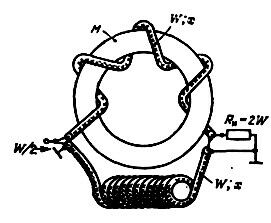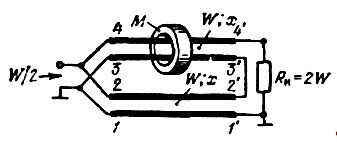 Входы этих линий с понижающей стороны ТШЛ соединены параллельно, а их выходы с повышающей стороны соединены последовательно. При этом вторая линия должна быть размещена на магнитопроводе: продета через него (рис.1.1.1,а) либо намотана на нем, как показано на рис.1.1.1,б. В таком трансформаторе можно выделить два процесса. Первый, специфичный для ТШЛ, представляет собой распространение колебаний по линиям и передачу мощности от источника на входе трансформатора к нагрузке на выходе. Для этого процесса характерно, что токи в любом сечении каждой линии равны по величине и противоположны по знаку. Поэтому можно считать, что вне пространства между проводниками магнитное поле отсутствует и соответственно магнитопровод не оказывает влияния на этот процесс. Для получения согласования с нагрузкой она должна быть равна удвоенному волновому сопротивлению линии, т.е. Rн=2W. В этом случае в линиях имеет место режим бегущей волны и входное сопротивление с пониженной стороны трансформатора равно W/2.