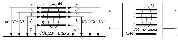 Рассмотрим более подробно общую модель ШТЛ (рис.1.1.4,б). В реальных устройствах наибольшие поперечные размеры линий малы по сравнению с кратчайшей рабочей длиной волны, что позволяет при описании волнового процесса распространения колебаний по ним пользоваться «ТЕМ-приближением». Известно, что передачу ТЕМ-колебаний по линиям можно представить суперпозицией n—1 колебаний противофазных типов (нечетных мод) и одного колебания синфазного типа (четной моды) [11]. Для каждого колебания противофазного типа сумма токов в проводниках 1,2,3,...,п для любого сечения линии и ток в опорном (n+1)-м проводнике равна нулю и отсутствует индукция в магнитопроводе. Колебания противофазного типа, имеющие адекватный характер распространения и связанные с проводниками 1,2,3,...,п (рис.1.1.5,а), осуществляют передачу энергии и определяют характеристики ШТЛ в основной части рабочего диапазона частот. Эти колебания имеют единую частотно-независимую постоянную распространения, полагая, что линия имеет однородное заполнение (диэлектриком). В результате для линии на рис. 1.1.5,а правомерна система уравнений [11].