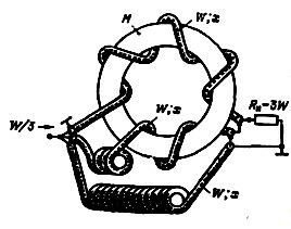 Для выравнивания длин двухпроводных линий (образующих обмотки с разным числом витков) с целью выполнения согласования для волнового процесса необходимо введение (n-1) ФЛ. При выполнении ШТЛ на раздельных магнитопроводах значение L1 резко снижается, поскольку в этом случае оно определяется параллельным соединением индуктивности обмотки 3-3' (L), 1/4 индуктивности обмотки 5—5', 1/9 индуктивности обмотки 7—7',..., 1/(n-1)2 индуктивности обмотки (2n) — (2n)'. Квадрат нормированного значения напряжения на обмотке определяет, во сколько раз уменьшается индуктивность этой обмотки при приведении ее к входу ШТЛ. Если индуктивности обмоток, размещенных на разных магнитопроводах, одинаковы, то L1 = 6L/n (п—1) (2n — 1), а индукции В в их магнитопроводах прямо пропорциональны напряжениям на обмотках. Выровнять индукцию в магнитопроводах (для получения одинаковых допустимых потерь в каждом из них) можно, увеличивая пропорционально напряжениям на обмотках либо сечения их магнитопроводов, либо числа витков. В первом случае L1 = 2L/n (п — 1), а во втором случае L1 = L/(п — 1).