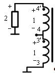 Поскольку напряжения на обмотках (рис.1.1.2,в), относящихся к разным линиям, различаются вдвое, то при размещении этих линий на общем магнитопроводе (рис.1.1.2,б) число витков обмоток должно отличатся в два раза, а направление их намотки определяется полярностью напряжений на проводниках.