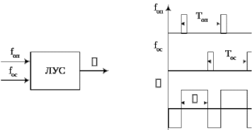 Работа ЛУС [1] (рисунок 1.2 а) основа на логической обработке порядка следования во времени импульсов двух входных сигналов: опорного с частотой fоп и контролируемого с частотой fос. Выходной сигнал ЛУС γ в линейном режиме работы электропривода (fоп ≈ fос) представляет собой последовательность импульсов с периодом следования Топ и длительностью τ, равной временному интервалу между импульсами частот fоп и fос (рисунок 1.2 б, где