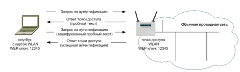 cторона А передает кадр аутентификации, который включает полученный от стороны В текст запроса. Кадр шифруется с использованием схемы WEP.