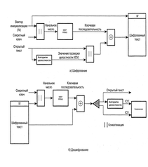 После получения шифрованного сообщения (рис.1.2, б) приемник извлекает вектор инициализации и присоединяет его к совместно используемому секретному ключу, после чего генерирует ту же псевдослучайную последовательность, что и источник на передающей стороне. К полученному таким образом ключу и поступившим данным побитово применяется операция исключающего ИЛИ, результатом которой является исходный передаваемый текст.