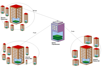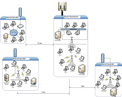 Из рассмотрения рис.3.1 видно, что центр управления сети соединен с объектом информатизации (жилым районом №1) по средствам кабельной сети, другие объекты информатизации (районы) не подключены по причине существующих преград. Прокладка этих кабелей затруднена по причине наличия водных преград (река Нара) и проложенных железнодорожных путей. Успешное разрешение проблемы объединения объектов информатизации (штабов) в единую локальную вычислительную сеть посредствам прокладки кабеля практически не возможна, так как требует чрезмерно высоких экономических затрат, что подтверждает прейскурант цен прокладки кабеля, представленный в таблице 2.1. Решение задачи объединения объектов информатизации (районов) возможна при помощи беспроводных технологий построения локальных сетей.