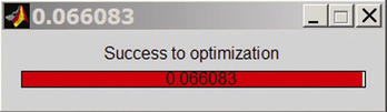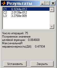После этого нажимаем на кнопку Пуск. Если была выбрана оптимизация, то появляется окно (рисунок 2.3) свидетельствующее о процессе оптимизации. Этот процесс зависит от сложности схемы и может длиться несколько минут. По окончании процесса оптимизации появляется информационное окно изображенное на рисунке 2.4. В нем выводиться значения элементов, подвергнутые оптимизации. При желании их можно в нести в главную программу нажав Установить. Также в этом окне выводятся данные о количестве произведенных итераций, полученном значении целевой функции и максимальной неравномерности АЧХ выраженной в децибелах.