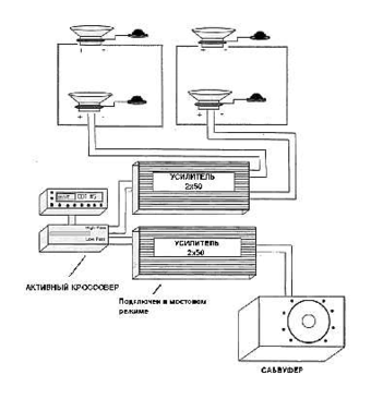 На рисунке 2 показана схема усиления низкочастотного спектра звукового сигнала отдельно от среднего и высокочастотного диапазонов, разделенных электронным кроссовером. Так как сабвуфер имеет К.П.Д. меньший, чем высокочастотный динамик, он потребляет больше мощности от усилителя, чем последний, для создания равного звукового давления. Усиливаясь в одном усилителе, низкие частоты отбирают большую часть мощности и практически ничего не оставляют для средних и высоких частот, которые начинают плохо вырисовываться в звуковой картине. Увеличение громкости для "вытягивания" средних и высоких приводит к искажениям в области низких частот. Звуковая картина окончательно портится.