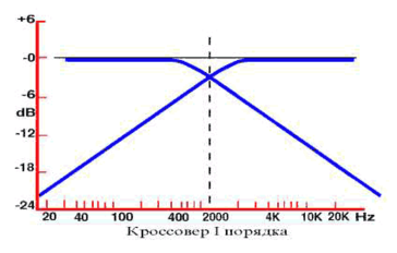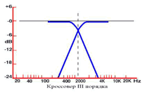 Допустим, кроссовер имеет частоту среза равную 1000 Гц. Это означает, что один из его фильтров срезает все частоты ниже 1000 Гц и пропускает только частоты выше 1000 Гц. Такой фильтр называют high-pass фильтром. Другой фильтр, пропускающий частоты ниже 1000 Гц называется low-pass,. Графически работа этого кроссовера представлена на рисунке 4. Точка пересечения двух кривых есть частота среза кроссовера равная 1000 Гц. В трехполосных кроссоверах присутствует еще и среднечастотный фильтр (band-pass), который пропускает только средний диапазон частот (приблизительно от 600 Гц до 5000 Гц.) На рисунке 6 изображена частотная характеристика трехполосного кроссовера.