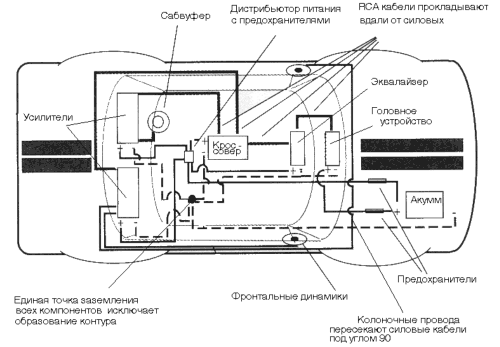 Начинаем вести к усилителю акустические, межблочные и силовые провода. Силовые провода должны быть проложены отдельно от акустических и межблочных. Допускается их взаимное пересечение под углом в 90 градусов. Желательно вообще каждую группу проводов проложить отдельно, в том числе и от штатной проводки автомобиля.