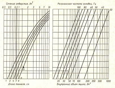 для приближенного расчета фазоинвертора можно воспользоваться номограммой, приведенной на рис. 14. Выбрав объем корпуса, восстанавливаем по правой номограмме перпендикуляр из точки объема до пересечения с кривой резонансной частоты головки, затем из этой точки проводим горизонталь на левую номограмму до пересечения с вертикалью выбранного сечения тоннеля. Точка пересечения попадает на кривую длины тоннеля. Если полученная величина является неприемлемой, можно выбрать другие начальные условия. Однако следует иметь в виду, что передаточную характеристику салона в этом случае придется учитывать отдельно.