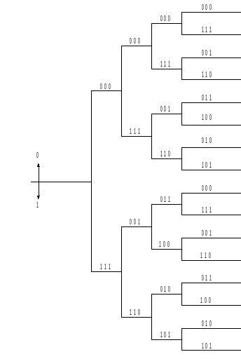 Предположим, что кодер находится в нулевом состоянии (все нули). Диаграмма показывает, что, если первый вход 0 – выходная последовательность 000, а если первый вход 1 – выходная последовательность 111. Если в следующий момент первый вход 1, а второй 0, то второй набор выходных бит 001. Далее, если третий входной бит 0, то выходная последовательность 011, если же третий входной бит 1, то на выходе – 100.