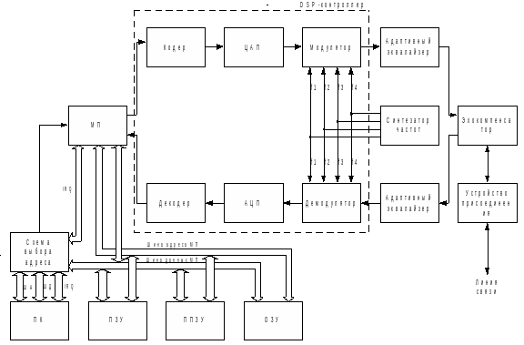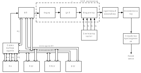 Процессы кодирования, декодирования, цифро-аналогового и аналого-цифрового преобразования, а так же модуляции и демодуляции выполняются микропроцессорной системой. Эта система имеет в своем составе постоянное запоминающее устройство (ПЗУ), которое содержит программное обеспечение, обеспечивающее выполнение определенных функций микропроцессорной системы. Так же в нее входят оперативное запоминающее устройство (ОЗУ) и перепрограммируемое постоянное запоминающее устройство (ППЗУ). ОЗУ используется для хранения промежуточных результатов вычислений, ключевых данных. В ППЗУ заносятся временные алгоритмы работы микропроцессорной системы. Все преобразования, которым подвергается сигнал, выполняются в самом микропроцессоре (МП). К используемому микропроцессору предъявляются особые требования. Так как при реализации алгоритмов кодирования и декодирования основной математической операцией является умножение с плавающей запятой, то при использовании классических МП резко возрастает сложность написания программ и время их выполнения. Сегодня в цифровой обработке сигналов широко применяются цифровые сигнальные процессоры, называемые еще – DSP-контроллерами. Основное достоинство этих DSP-контроллеров - возможность выполнения однотактных умножений, сложений, наличие специфических команд, таких как двоичная инверсия. Использование такого DSP-контроллера резко снижает требования к его быстродействию, что положительно сказывается на цене системы. Используя в микропроцессорной системе, наряду с обычным микропроцессором, DSP-контроллер, можно перераспределить выполняемые функции. Так МП занимается организацией обмена данными по шине данных с ПК, генерируя и получая адресную информацию по шине адреса, то есть выполняет функции внутреннего интерфейса. Так как быстродействие DSP-контроллера на много выше МП, то он выполняет функции кодирования, декодирования, цифро-аналогового и аналого-цифрового преобразования, а так же модуляции и демодуляции.