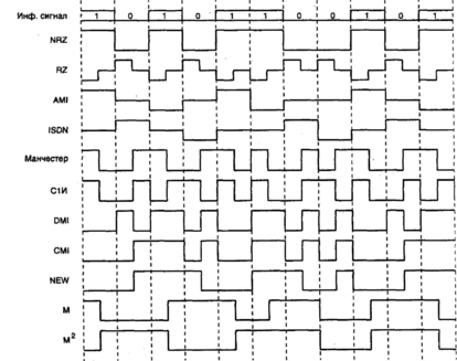Перечисленные проблемы решаются при помощи линейного кодирования. Параметры получаемого линейного сигнала должны быть согласованы с характеристикой, используемой линии, и отвечать ряду следующих требований. Энергетический спектр линейного сигнала должен быть как можно уже. В нем должна отсутствовать постоянная составляющая, что позволяет повысить верность либо дальность передачи. Структура линейного сигнала должна обеспечивать возможность выделения тактовой частоты на приемной стороне. Необходимо обеспечить возможность постоянного контроля за ошибками на уровне физической линии. Линейный код должен иметь достаточно простую техническую реализацию. Примеры линейных кодов приведены на рис. 4.1 [2].