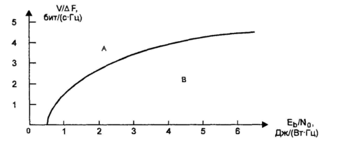 Вероятность ошибочного приема бита в конкретной системе передачи определяется отношением PС/РШ. Из формулы Шеннона следует, что возрастание удельной скорости передачи V/F требует увеличения энергетических затрат (РС) на один бит. Зависимость удельной скорости передачи от отношения сигнал/шум показана на рис. 5.1.