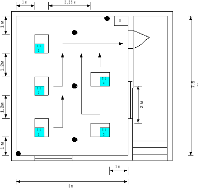 Схема размещения рабочих мест, план эвакуации и план размещения средств пожаротушения показан на рис. 8.2, где Я – ящик с песком,