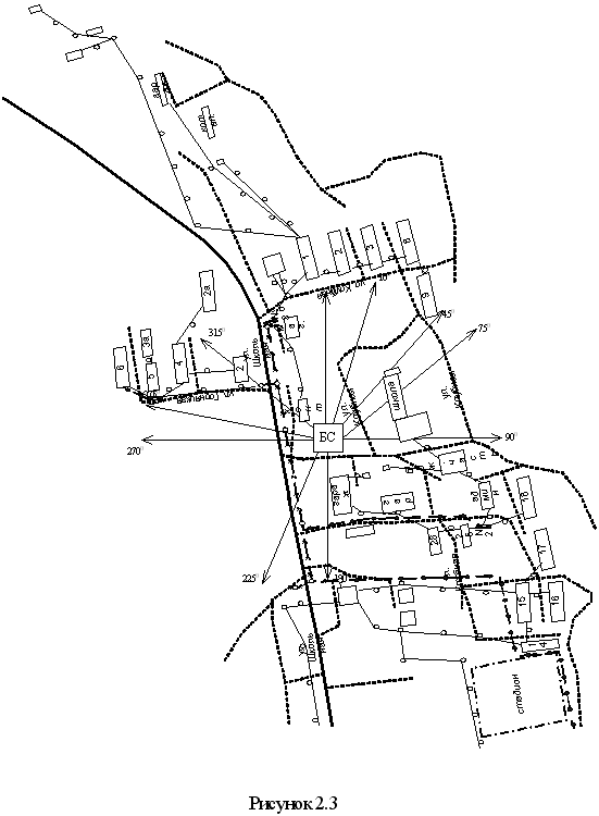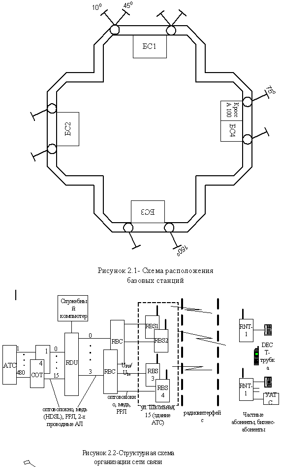 На основании выше сказанного, приступаем к непосредственному размещению БС. В качестве здания на котором будет производиться установка БС используем здание (3 этажа, высота 10 метров) по ул. Школьной, 15. Размещаем комплекты БС на кровле этого дома. Расстояние от АТС до кроссового ящика 20 м. На каждую БС идет по три витых пары (кабель ТПП-50х2х0,4). В будущем будет использоваться волокно. Кроссовый ящик установлен вблизи базовых станций. Схема расположения базовых станций на кровле жилого дома по ул. Школьной показана на рисунке 2.1. Ситуационная схема, показывающая зону обслуживания, представлена на рисунке 2.3. Структурная схема организации сети связи с учетом всех выше изложенных факторов представлена на рисунке 2.2.