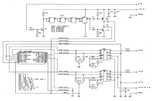 Главным элементом схемы является магниторезистивный датчик HMC1022.