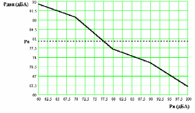 Рис. П.5.1. Зависимость допустимого значения звукового давления от величины звукового давления развиваемого в месте установки электродинамического громкоговорителя 5 ГДШ