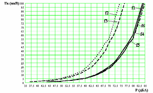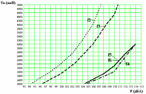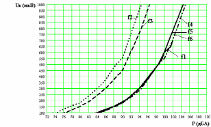 Рис. 5.1 Зависимость напряжения на микрофоне Uк от величины звукового давления P, развиваемого внутри камеры для частот f1=250Гц, f2=500Гц, f3=1кГц, f4=2кГц, f5=4кГц, f6=8кГц (Uк=0100мкВ)