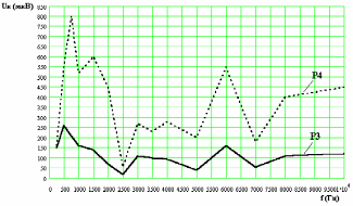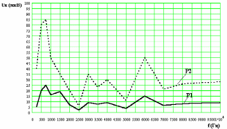 Рис. 5.6. Зависимость напряжения на микрофоне Uк от частоты для величины звукового давления, развиваемого внутри камеры P1=60 дБА, Р2=70 дБА.