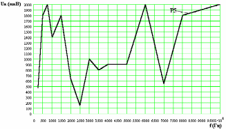Рис. 5.8. Зависимость напряжения на микрофоне Uк от частоты для величины звукового давления, развиваемого внутри камеры P5=100 дБА.
