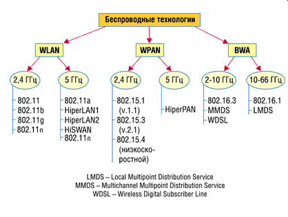 При построении сетей WLAN и WPAN, а также систем широкополосного беспроводного доступа (BWA - Broadband Wireless Access) применяются сходные технологии. Ключевое различие между ними (рис. 1.2) - диапазон рабочих частот и характеристики радиоинтерфейса. Сети WLAN и WPAN работают в нелицензионных диапазонах частот 2,4 и 5 ГГц, т. е. при их развертывании не требуется частотного планирования и координации с другими радиосетями, работающими в том же диапазоне. Сети BWA (Broadband Wireless Access) используют как лицензионные, так и нелицензионные диапазоны (от 2 до 66 ГГц).