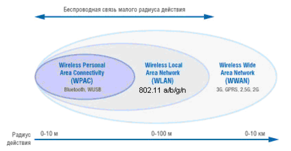 Различают три типа беспроводных сетей (рис. 1.1): WWAN (Wireless Wide Area Network), WLAN (Wireless Local Area Network) и WPAN (Wireless Personal Area Network)