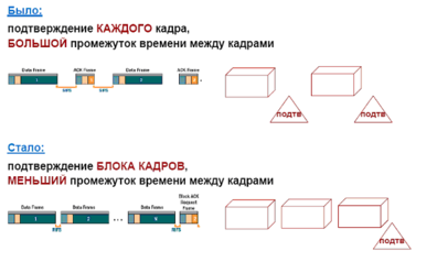 Первые два фактора относились к физическому каналу. Третий важный фактор увеличения производительности – оптимизация протокола передачи данных на уровне доступа к среде. В предыдущих версиях прием каждого переданного кадра (порции данных) должен был подтверждаться приемной стороной. В новой версии введена возможность блокового подтверждения. Приемник информации передает одно подтверждение сразу на несколько успешно принятых кадров, что уменьшает загрузку общей пропускной способности канала служебными сообщениями. Кроме того, уменьшен временной промежуток между кадрами, что также позволило повысить полезную пропускную способность. Проводя аналогии с повседневной жизнью, можно сравнить кадры с контейнерами для перевозок грузов. Новые правила 802.11 n позволили уменьшить дистанцию между контейнерами и позволили диспетчеру подтверждать не каждый груз в отдельности, а сразу партию грузов.
