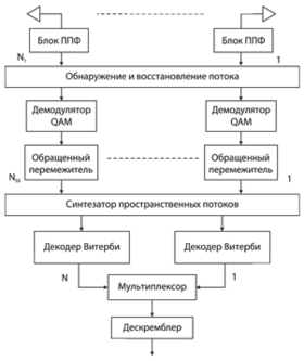 Кодированная последовательность разделяется на отдельные пространственные потоки. Биты в каждом потоке перемеживаются (для устранения блочных ошибок), а затем модулируются. Далее происходит формирование пространственно-временных потоков, которые проходят через блок обратного быстрого преобразования Фурье и поступают на антенны. Количество пространственно-временных потоков равно количеству антенн. Структура приемника аналогична структуре передатчика изображена на рисунке 1.6, но все действия выполняются в обратном порядке.