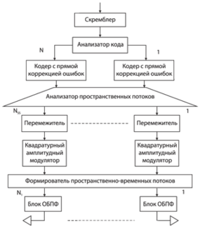 В стандарте IEEE 802.11n допускается использование до четырех антенн у точки доступа и беспроводного адаптера. Обязательный режим подразумевает поддержку двух антенн у точки доступа и одной антенны и беспроводного адаптера. В стандарте IEEE 802.11n предусмотрены как стандартные каналы связи шириной 20 МГц, так и каналы с удвоенной шириной. Общая структурная схема передатчика изображена на рисунке 1.5. Передаваемые данные проходят через скремблер, который вставляет в код дополнительные нули или единицы (так называемое маскирование псевдослучайным шумом), чтобы избежать длинных последовательностей одинаковых символов. Затем данные разделяются на N потоков и поступают на кодер с прямой коррекцией ошибок (FEC). Для систем с одной или двумя антеннами N = 1, а если используются три или четыре передающих канала, то N = 2.
